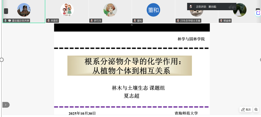 2025年10月30日下午,安徽农业大学林学与园林学院夏志超教授应青海师范大学生命科学学院邀请,在线上作了题为《根系分泌物介导的化学作用:从植物个体到相互关系》的学术讲座。本次讲座由生命科学学院关晋宏副教授主持,吸引了来自北京师范大学、中国科学院西北高原生物研究所、以及本校师生约50余人参加。