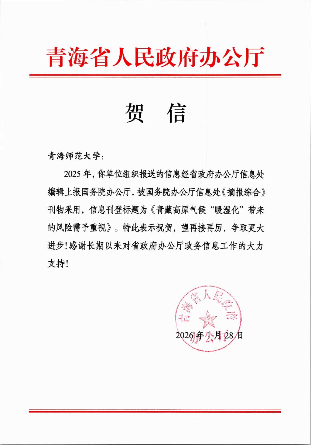 近日,我校收到青海省人民政府办公厅贺信,就2025年由我校组织报送的信息经省政府办公厅信息处编辑,上报国务院办公厅,被国务院办公厅信息处《摘报综合》刊物采用,信息刊登标题为《青藏高原气候“暖湿化”带来的风险需予重视》。