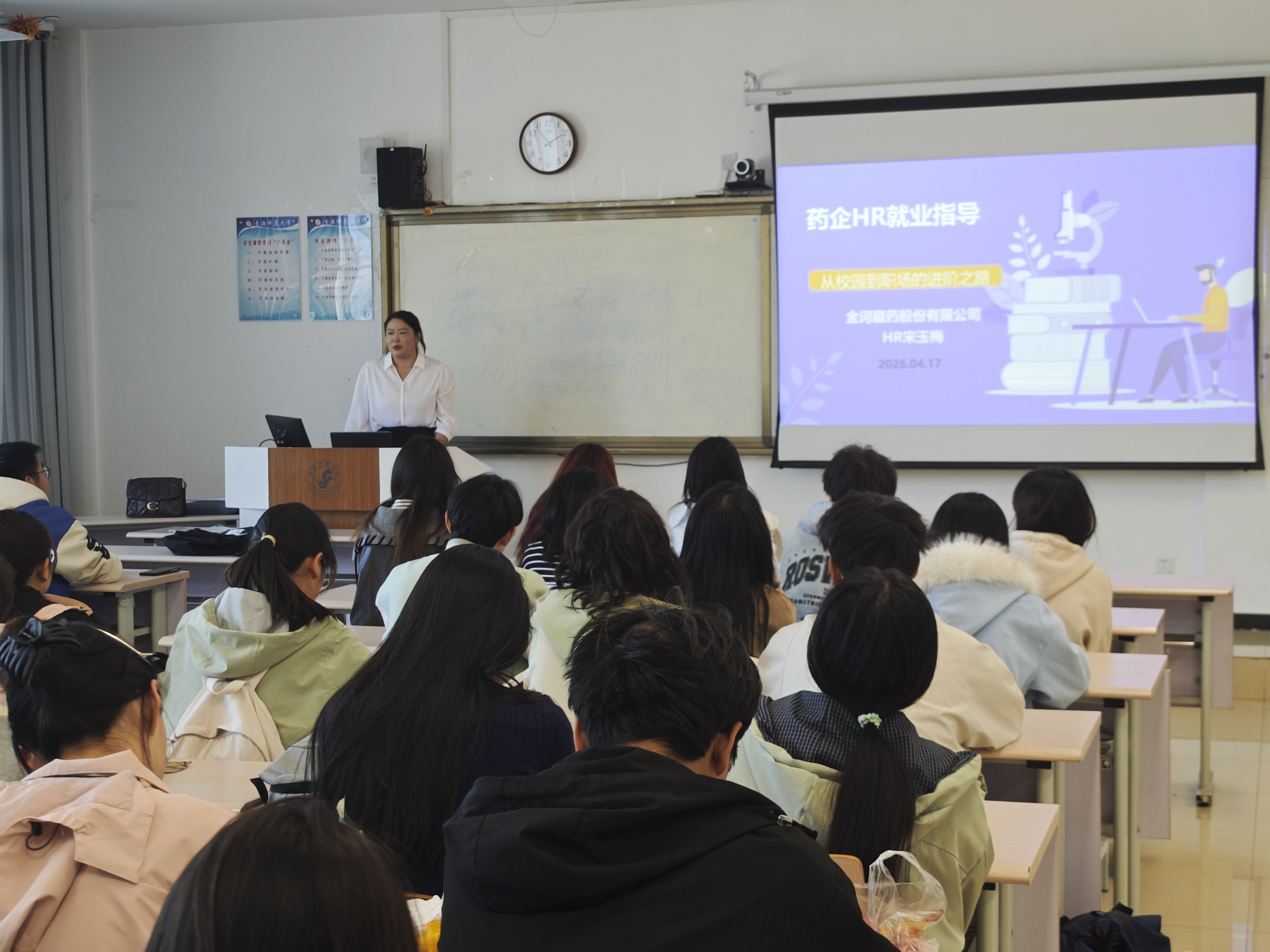 宋玉梅总监深耕医药、生物科技行业人力资源管理领域14年,拥有丰富的实战经验与专业素养。讲座中,她结合自身从基层HR成长为企业人力高管的职业历程,围绕药企HR职业发展路径、校招求职核心要点、职场晋升逻辑及核心能力打造四大维度展开系统讲解。她深入剖析医药行业人才需求趋势,拆解药企招聘的选拔标准与评价体系,针对简历撰写、面试技巧、岗位匹配等求职关键环节提供实操建议;同时聚焦职场新人成长痛点,分享高效融入团队、提升专业能力、构建职业竞争力的实用方法,为在场学生呈现了一场兼具理论深度与实践价值的职业指导盛宴。同学们纷纷表示,本次讲座精准对接就业需求,不仅解开了职业规划中的诸多困惑,更清晰了从校园到职场的进阶路径,为后续求职与职业发展提供了有力指引。