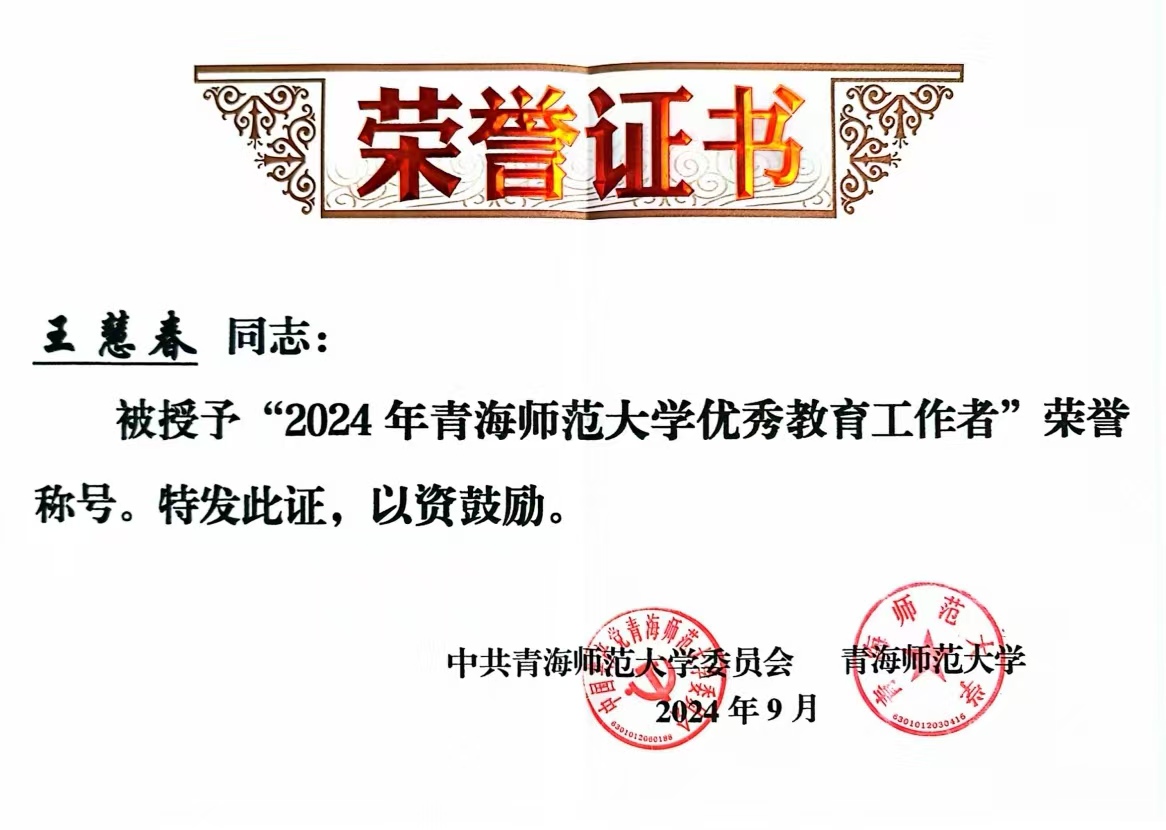 王慧春,女,1974年生,青海海东人,陕西师范大学有机化学博士,现为青海师范大学生命科学学院教授,博士生导师。2024年被授予青海师范大学“优秀教育工作者”荣誉称号。