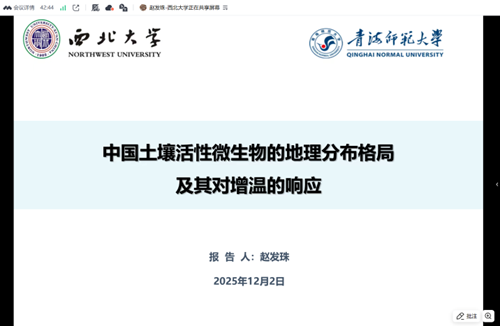 2025年12月2日晚,青海省青藏高原生物多样性形成机制与综合利用重点实验室特邀西北大学城市与环境学院赵发珠教授,开展了题为《中国土壤活性微生物的地理分布格局及其对增温的响应》的线上学术讲座。本次讲座由青海师范大学生命科学学院关晋宏副教授主持,实验室成员及相关高校师生约50人线上参与。